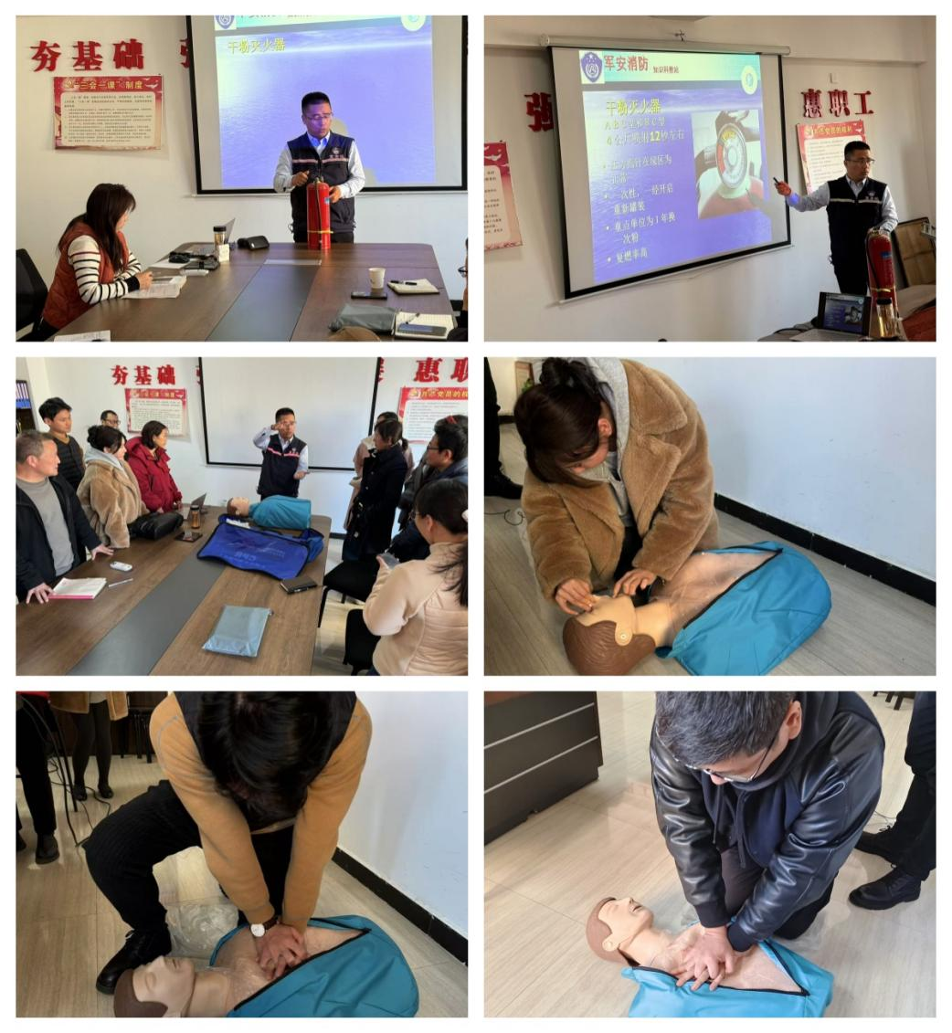 培訓會上,教官通過“小火亡人”典型事故案例剖析與實際操作相結合的方式,全面細致講解火災預防(如辦公及租賃場所電氣設備規(guī)范使用、電動車電池等易燃物存放要點)、火災報警流程及注意事項、各類滅火器材(干粉、水基、氣溶膠滅火器)使用方法演示及實操練習,以及逃生自救技巧(濕毛巾捂住口鼻或佩戴防煙面具彎腰低姿前行、正確選擇疏散通道)、急救演練等方面內容,確保員工在實操中加深對消防安全知識的理解。